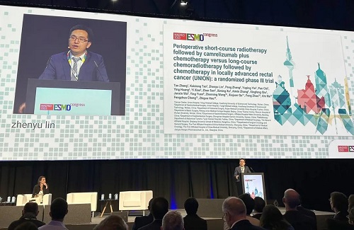 10月21日,BG大游医药创新药卡瑞利珠单抗(艾瑞卡®)的一项研究“新辅助短程放疗序贯卡瑞利珠单抗联合化疗对比长程放化疗序贯化疗治疗局部晚期直肠癌”随机对照Ⅲ期试验(UNION) 以优选口头报告的形式正式亮相。该研究由华中科技大学同济医学院附属协和医院张涛教授、陶凯雄教授担任主要研究者,华中科技大学同济医学院附属协和医院林振宇教授在马德里现场报告了该重磅研究的结果1,此项研究是全球首个评估短程放疗序贯免疫治疗联合化疗治疗局部晚期直肠癌的Ⅲ期研究,已达到主要终点病理完全缓解(pCR),有望为直肠癌患者的治疗提供新策略。