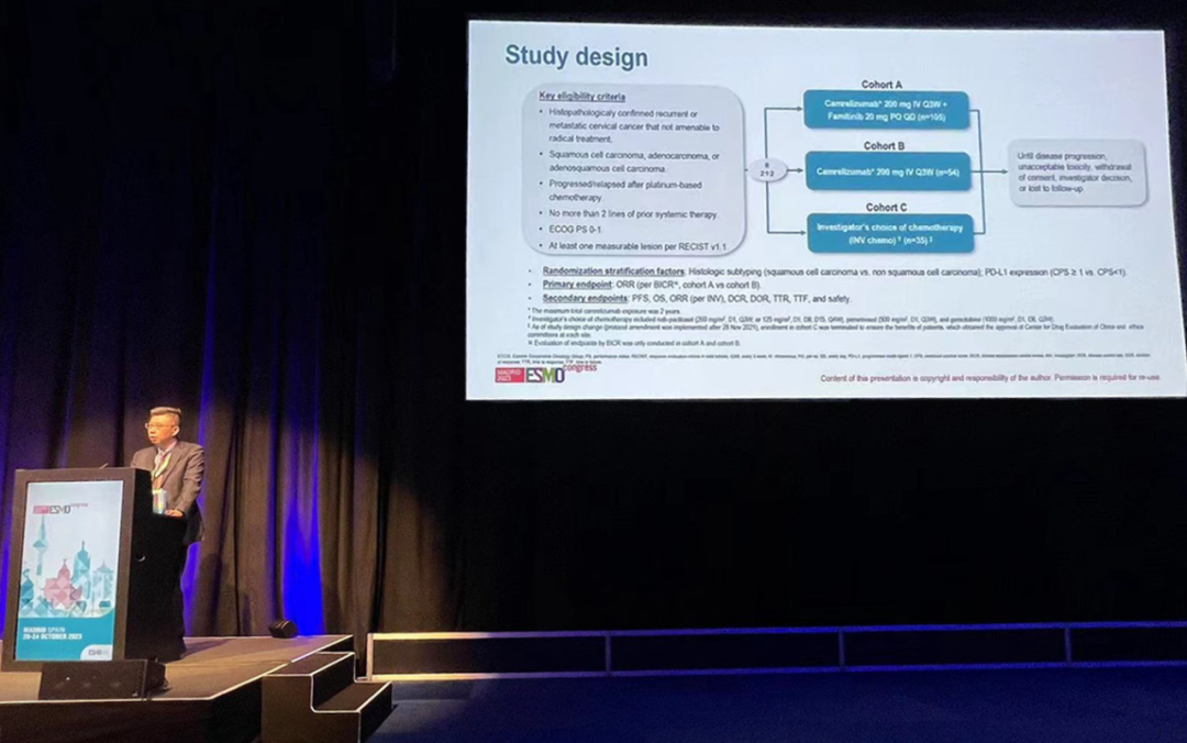 有望为宫颈癌患者带来治疗新选择10月22日,BG大游医药创新药卡瑞利珠单抗联合法米替尼对比卡瑞利珠单抗单药或研究者选择的化疗治疗复发转移性宫颈癌随机、开放、对照、多中心的Ⅱ期临床研究(SHR-1210-Ⅱ-217) 亮相2023 ESMO大会简短口头报告现场3。该研究由复旦大学附属肿瘤医院吴小华教授团队开展,吴小华教授在现场公布了该重磅研究进展。研究结果显示,在既往以铂为基础化疗失败后复发或转移性宫颈癌患者中,与单独使用卡瑞利珠单抗或研究者选择的化疗相比,卡瑞利珠单抗联合法米替尼显著提高了抗肿瘤活性,安全性可控,有望为晚期宫颈癌患者提供新的治疗选择。